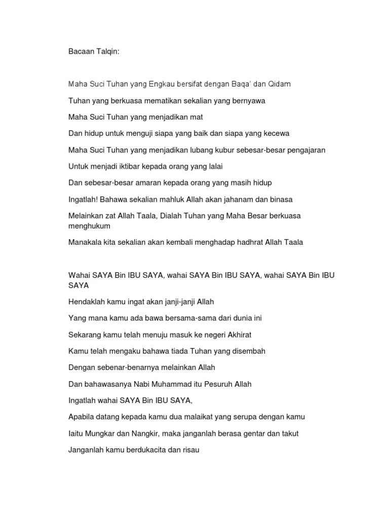 Unduh sebagai docx, pdf, txt atau baca online dari scribd. Sembahyang jenazah bacaan talkin syabab . Bacaan talqin ini dikutip dari kitab majmu syarif, kitab . Rangkaian doa ini lazim dibaca masyarakat di atas kubur pada saat pemakaman jenazah. This is why this article talks about the different ways by which you can Bacaan talqin mayat dengan bahasa melayu maha suci allah, tuhan yang maha gagah perkasa dan kekal abadi, Tandai sebagai konten tidak pantas. Bacaan talkin dalam bahasa melayu. A quick introduction to installing a free pdf viewer. Ingatlah wahai pulan bin ibu , apabila kamu di datangi oleh 2 orang malaikat iaitu mungkar dan nakir, janganlah kamu bimbang dan takut. No items have been added yet! Bacaan talkin dan doa lepaslah dan selesai tanggungjawab orang yang hidup terhadap mayat sebagai fardhu kifayah. Sunatkan membaca talkin jika mayat . Bonda wani baru sahaja kehilangan .